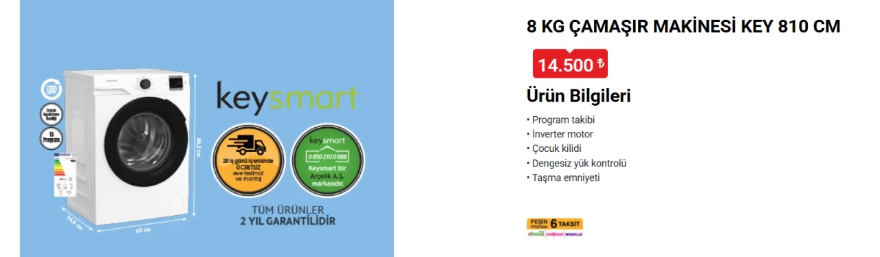 Keysmart 8 KG Çamaşır Makinesi KEY 810 CM – 14.500 TL