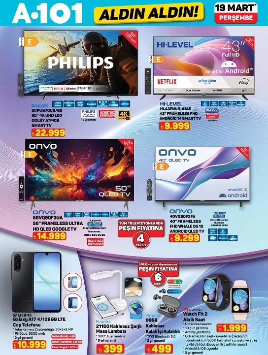 19 Mart 2026 Perşembe günü satışa çıkacak A101 Aldın Aldın kataloğu yayımlandı. Türkiye genelindeki A101 mağazalarında geçerli olacak kampanya kapsamında elektronik ürünlerden küçük ev aletlerine, bahçe ekipmanlarından müzik enstrümanlarına kadar geniş bir ürün yelpazesi raflara gelecek. Kampanyanın, sınırlı stokla satışa sunulacağı belirtildi.