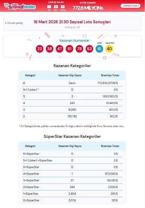 16 Mart 2026 tarihli çekilişte 769.979.394 TL tutarındaki büyük ikramiye devretti. Bir sonraki çekilişte büyük ikramiye tutarının daha da yükselmesi bekleniyor.