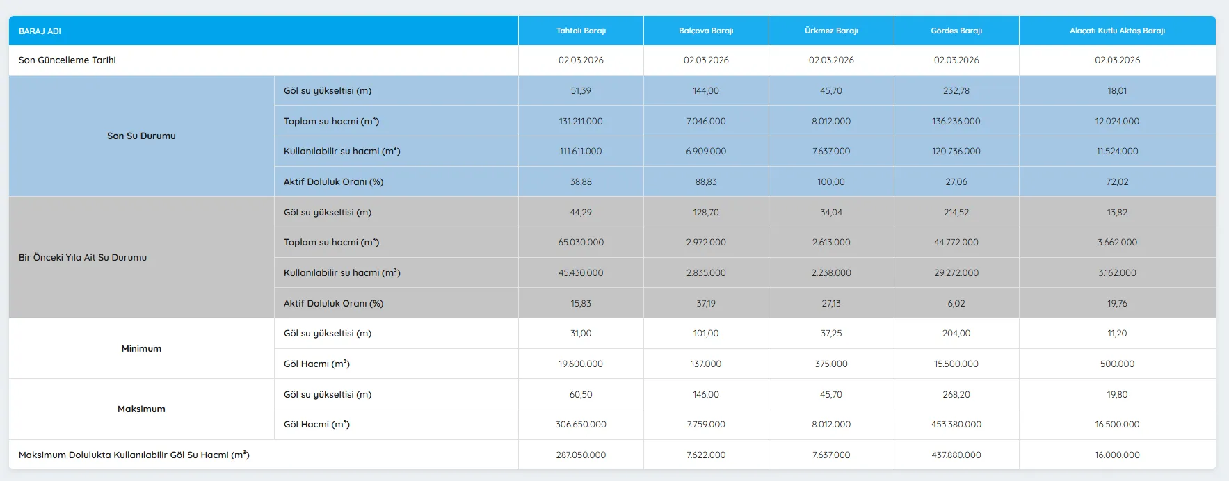 İzmir Su ve Kanalizasyon İdaresi (İZSU), kent genelindeki baraj doluluk oranlarının son yağışlarla birlikte önemli ölçüde arttığını duyurdu. Tahtalı, Balçova ve Ürkmez başta olmak üzere birçok barajda geçen yıla göre dikkat çeken yükseliş kaydedildi.