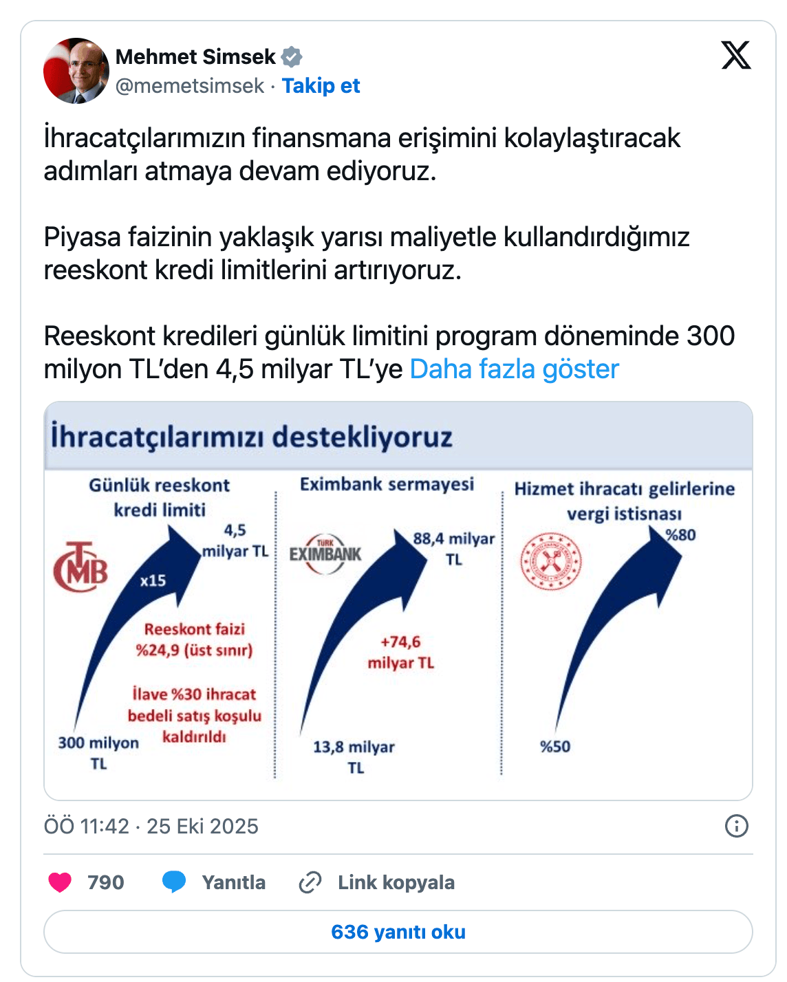 Hazine ve Maliye Bakanı Mehmet Şimşek, ihracatçılara finansman desteğini güçlendirmek amacıyla reeskont kredi limitlerinin 15 kat artırıldığını duyurdu. Şimşek, “Piyasa faizinin yarı maliyetiyle kredi sağlıyoruz, ihracatçımızın yanında olmaya devam edeceğiz” dedi.