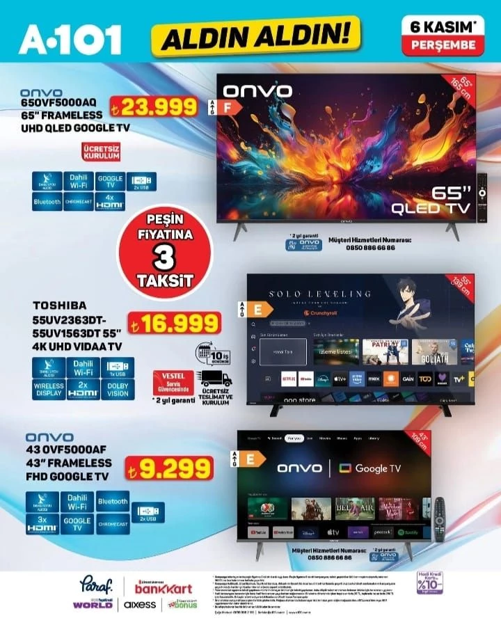 ONVO 65” Frameless UHD QLED Google TV – 23.999 TL