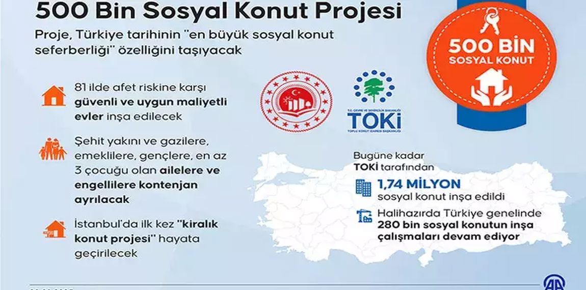 TOKİ’nin “Yüzyılın Konut Projesi” olarak tanımladığı 500 bin sosyal konut projesi, dar gelirli vatandaşlara uzun vadeli, düşük taksitli ev sahibi olma fırsatı sunacak.