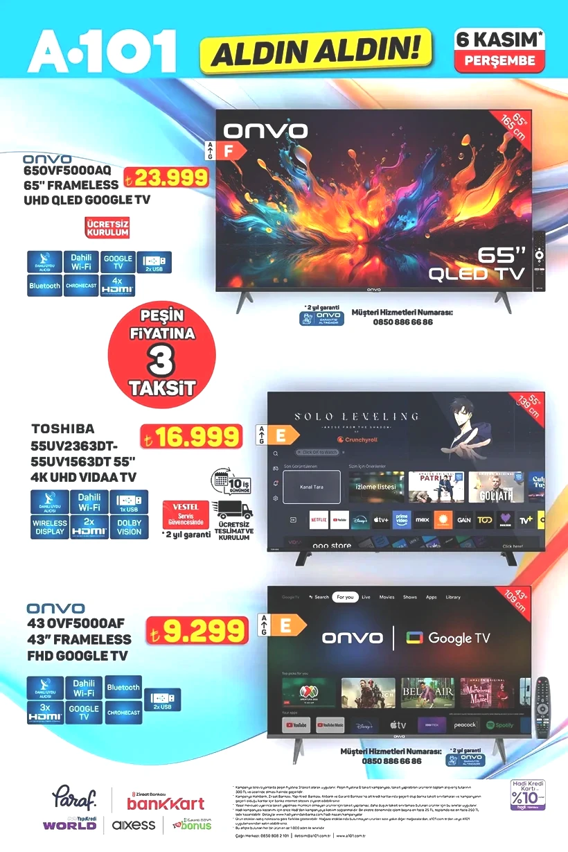 A101’in teknoloji reyonu bu hafta adeta dolup taşıyor. Özellikle Onvo QLED Google TV ve Toshiba 4K UHD TV modelleri öne çıkıyor.