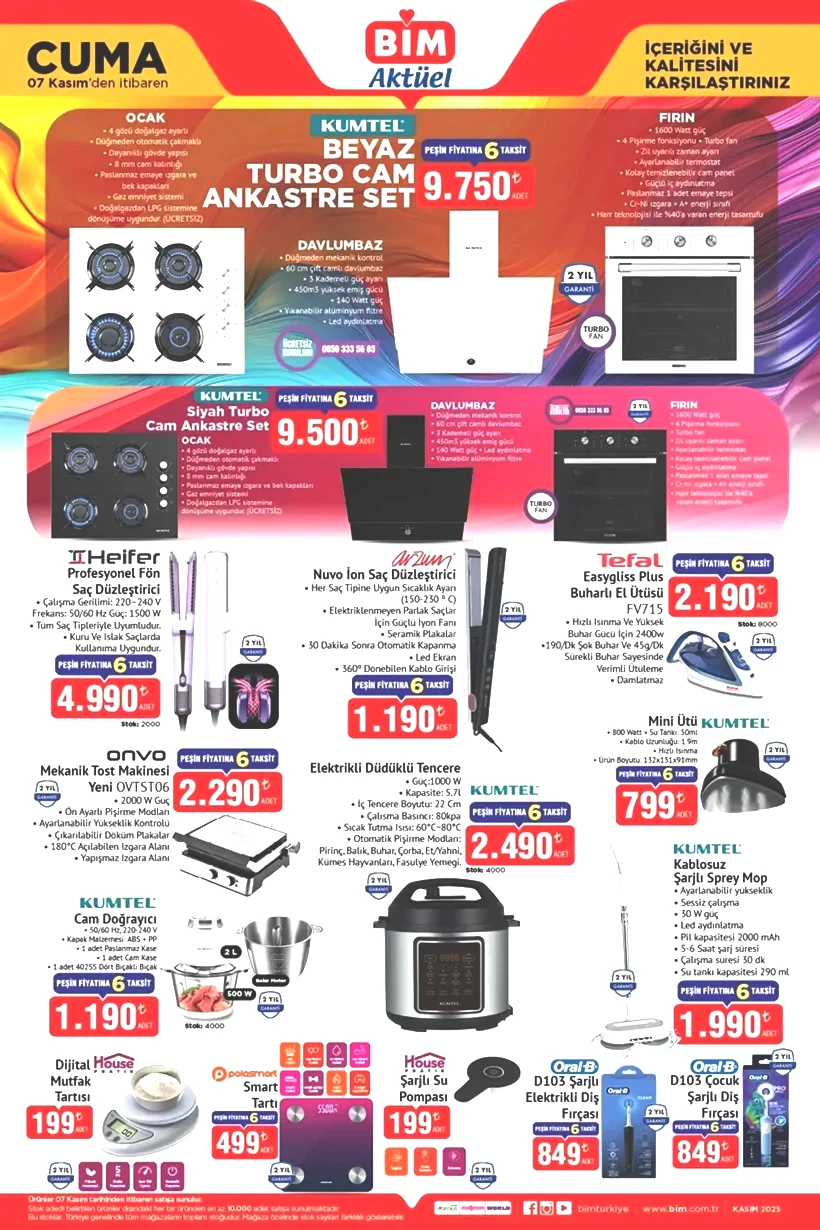 Ayrıca Kumtel Cam Ankastre Set (9.500 – 9.750 TL), elektrikli düdüklü tencere (2.490 TL) ve cam doğrayıcı (1.190 TL) de mutfak ürünleri arasında dikkat çekiyor.