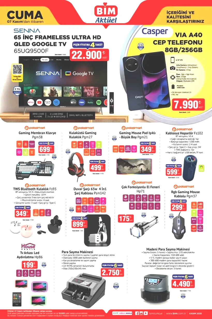 BİM’in 7 Kasım 2025 aktüel ürünler kataloğu yayımlandı! Bu hafta mağazalarda QLED televizyon, Casper cep telefonu, Philips küçük ev aletleri, Tefal tencere setleri, battaniyeler ve oyuncaklar büyük indirimlerle satışa sunuluyor. Elektronikten ev tekstiline kadar geniş ürün yelpazesiyle BİM yine dolu dolu geliyor.