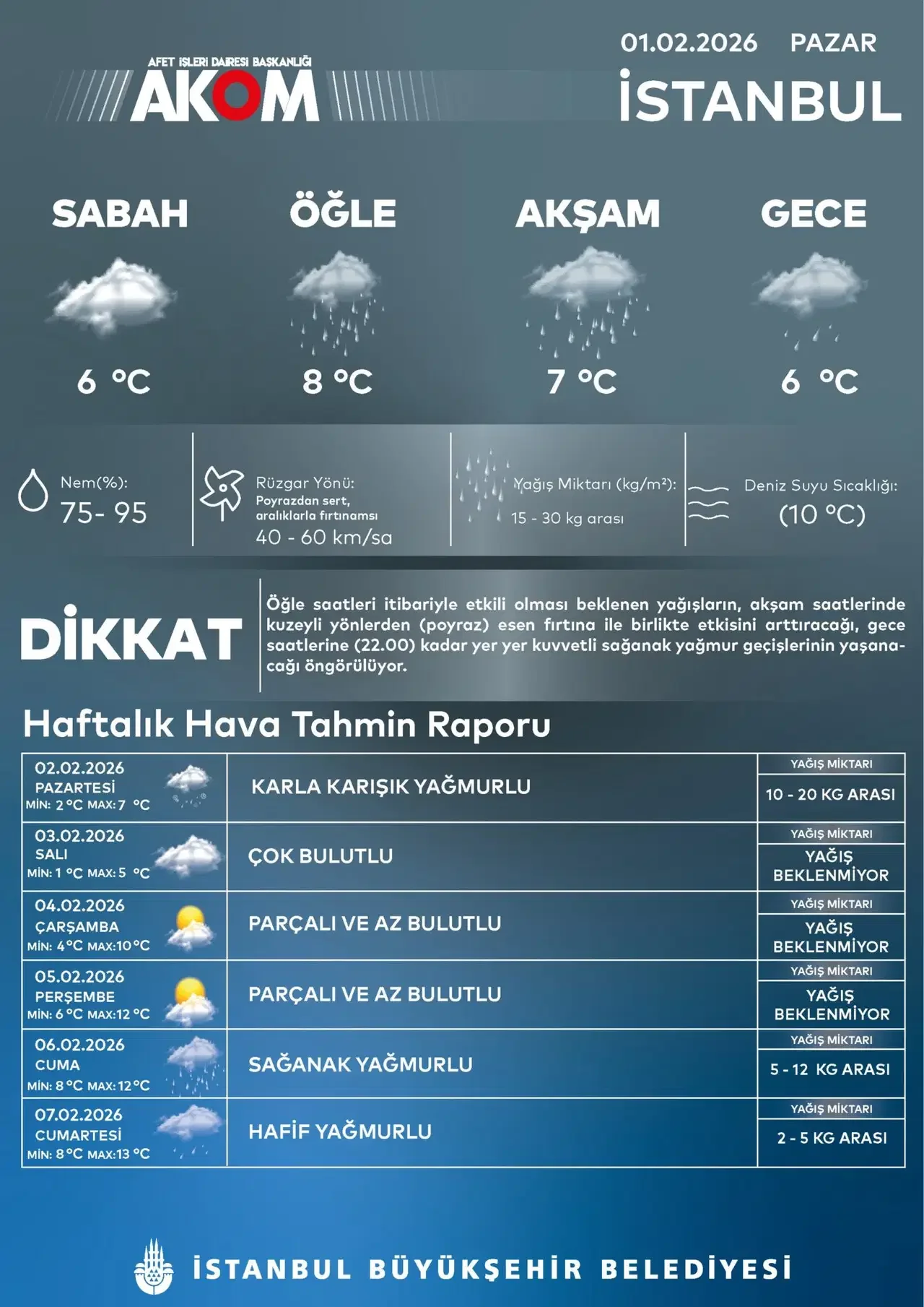 Bugün öğle saatlerinde başlaması beklenen yağışların, akşam saatlerinden itibaren poyraz fırtınasıyla birleşerek kuvvetlenmesi öngörülüyor. AKOM’un tahminlerine göre saat 22.00 civarında yer yer kuvvetli sağanak geçişleri yaşanacak. Metrekareye düşmesi beklenen yağış miktarının 10 ila 20 kilogram arasında olacağı ifade ediliyor. Bu durumun özellikle trafikte aksamalar yaratabileceği belirtiliyor.