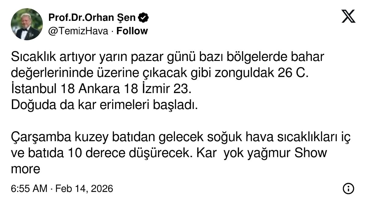 Meteoroloji uzmanı Orhan Şen, son günlerde kamuoyunda “kar ihtimali zayıfladı” yorumlarının ardından yaptığı değerlendirmede, soğuk hava beklentisinin sürdüğünü ancak kısa vadede kar öngörülmediğini belirtti. Şen, yeni kar ihtimali için 24–25 Şubat tarihine işaret etti.